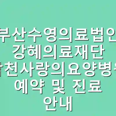 부산수영의료법인 강혜의료재단에 속한 남천사랑의요양병원은 전문적인 요양 서비스를 제공하는 기관입니다. 이 병원은 환자의 편안함과 안전을 최우선으로 하며, 다양한 진료시간과 예약 방법을 통해 환자들이 쉽게 접근할 수 있도록 하고 있습니다. 특히 일요일과 공휴일에도 진료를 제공하여, 환자들이 필요할 때 언제든지 상담받을 수 있는 여건을 마련하고 있습니다. 이 글을 통해 남천사랑의요양병원의 예약 방법, 진료시간, 및 전문의 상담에 대한 정보들을 상세히 안내드리겠습니다.